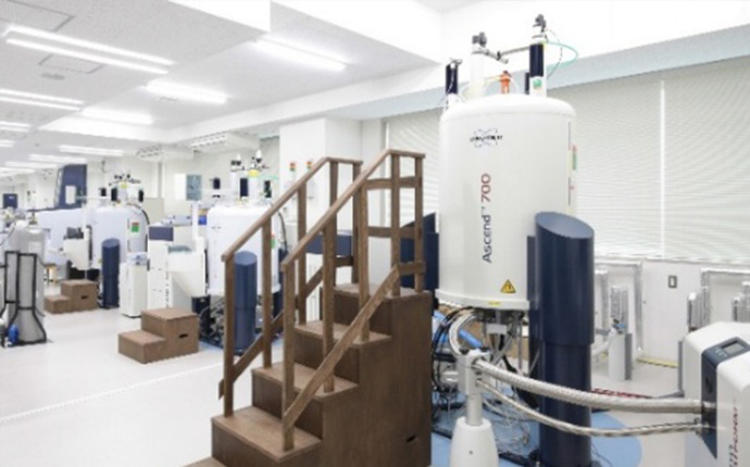 NMRを3台設置している中央機器室。中四国及び九州で最大規模の超高感度溶液測定用モデル。設置室は磁場の影響も考慮したレイアウトを作成。