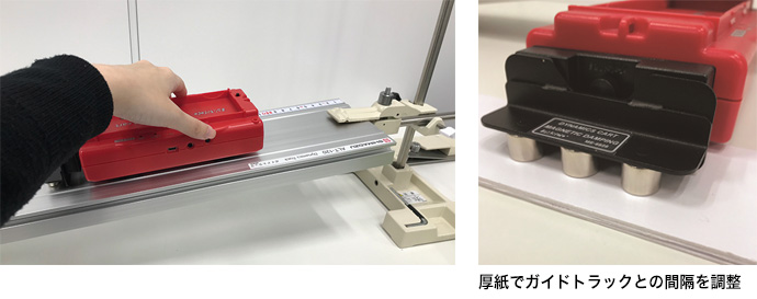 厚紙を磁石とガイドトラックの間に置き、マグネチックダンパーを下にスライドさせ、磁石が厚紙に接触するまで下ろします。その後、厚紙を取り外して使用します。