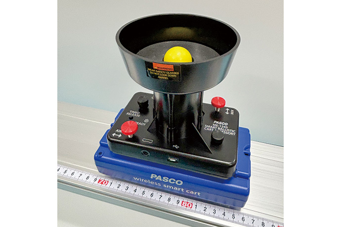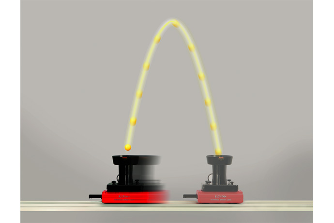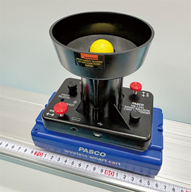 スマートカートの運動中に球を打ち上げてキャッチする動きから、慣性の法則の実験ができます。
